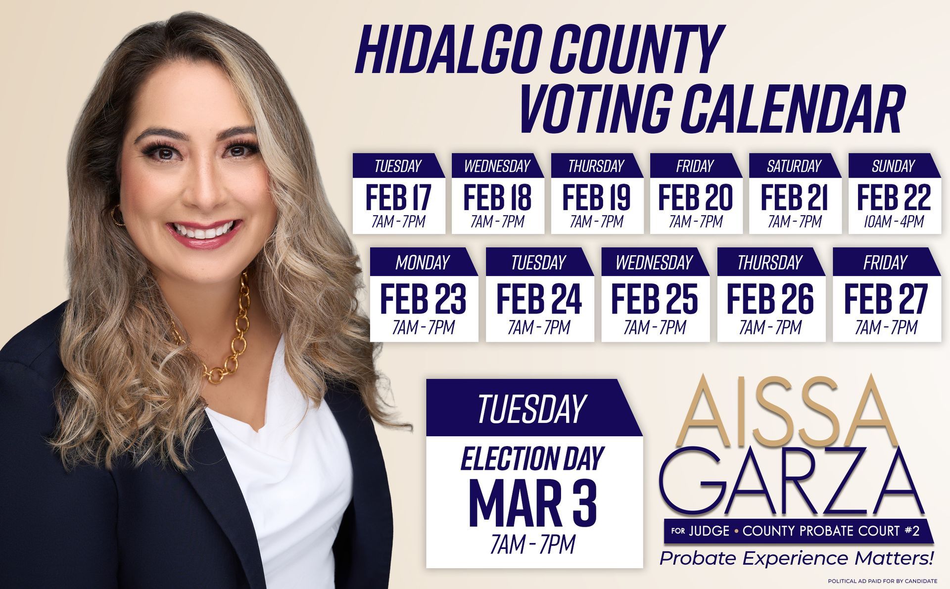 Hi, I'm Aissa I. Garza, a seasoned attorney with fifteen years of experience, CPA, and Certified Fraud Examiner, and I have officially announced my candidacy for Judge of the newly created Probate Court No. 2 of Hidalgo County. The establishment of this court comes at a pivotal time, as the community faces a rising number of estate, guardianship, and mental health cases that require skilled, professional, and compassionate judicial oversight.